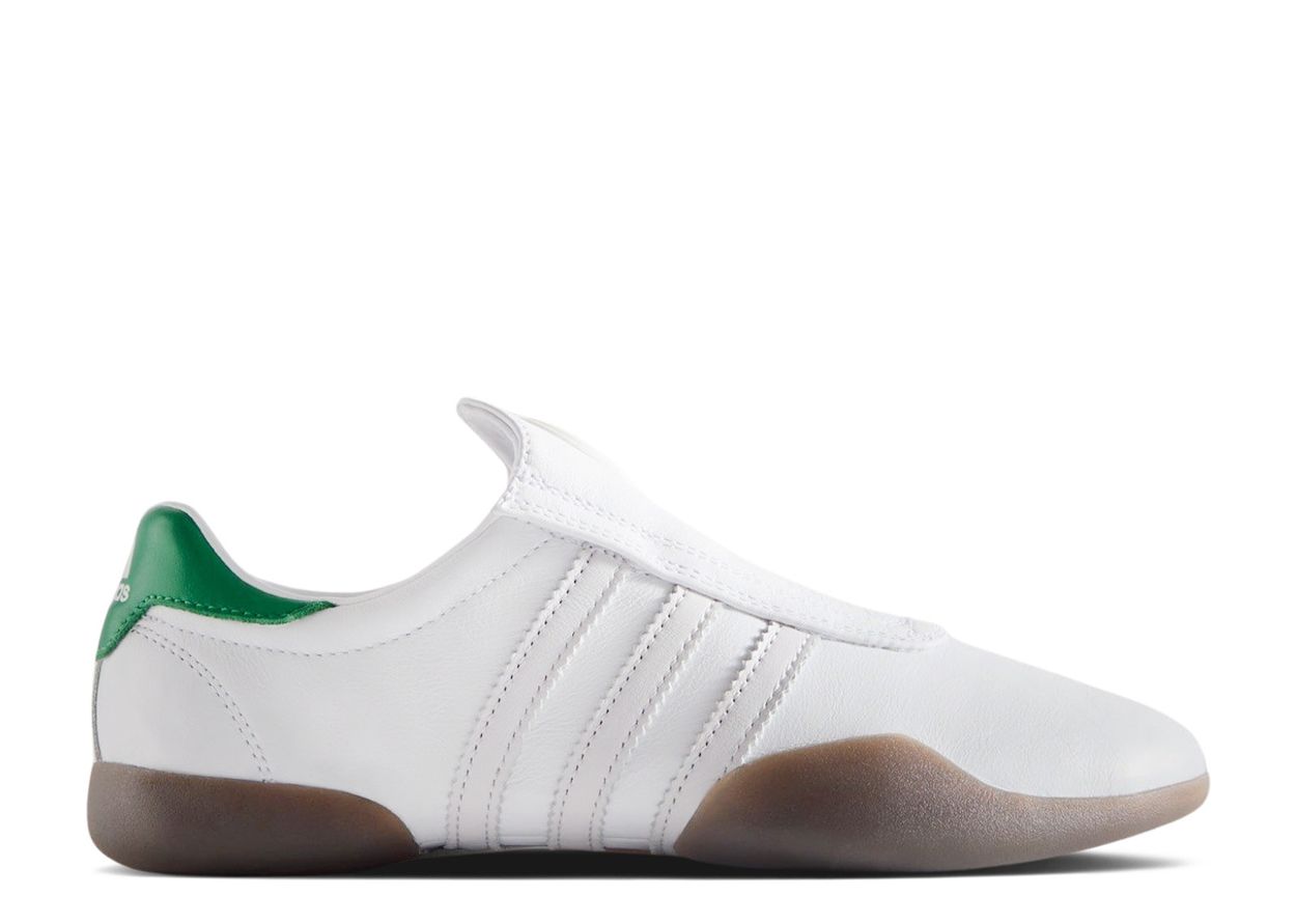 Der Kith x adidas Taekwondo Mei „Classic Program“ für Damen besticht durch ein weißes Leder-Obermaterial mit gepolstertem Schaftrand und farblich passenden Leder-Streifen. Die leuchtend grünen Laschen an der Ferse präsentieren das Kith-Box-Logo am linken und den adidas-Schriftzug am rechten Schuh. Dieselben Logos finden sich abwechselnd auf den Innensohlen wieder. Die geteilte Gummisohle rundet den Look ab.