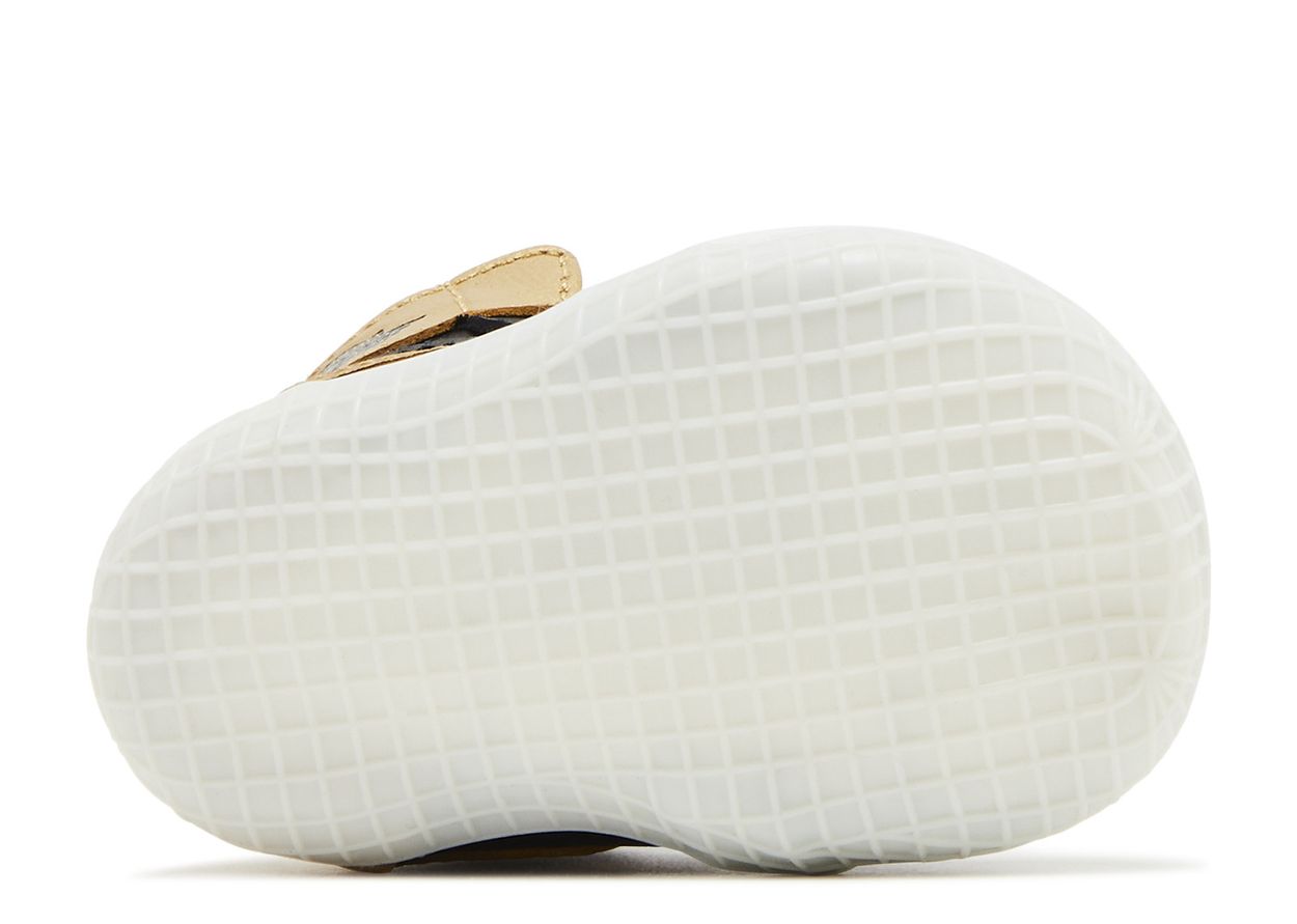 The Air Jordan 1 Retro High OG CB 'Black Metallic Gold' rocks a crib-sized bootie made for easy on and off. A hook-and-loop strap secures the black leather upper with contrasting metallic gold accents on the toe, heel, collar and the Swoosh. A white rubber outsole keeps every little step flexible and comfortable.