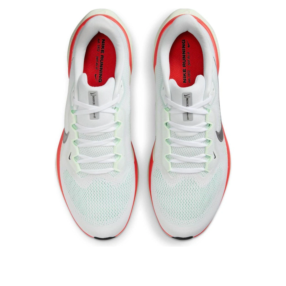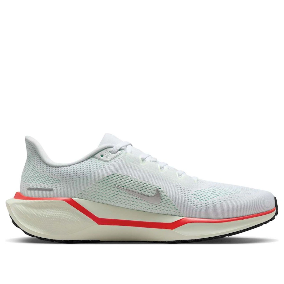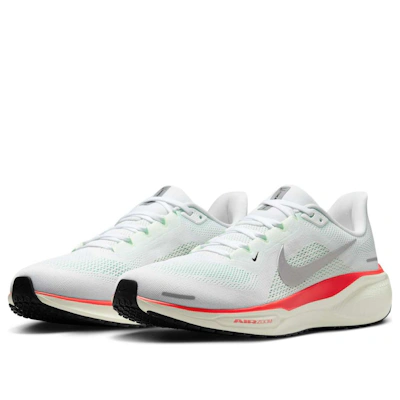 Erlebe unvergleichlichen Komfort und Performance mit dem Nike Air Zoom Pegasus 41. Sein elegantes Design in Weiß, Hellgrün, Rot und Metallic-Silber vereint Style mit reaktionsfreudiger Dämpfung für jeden Schritt.