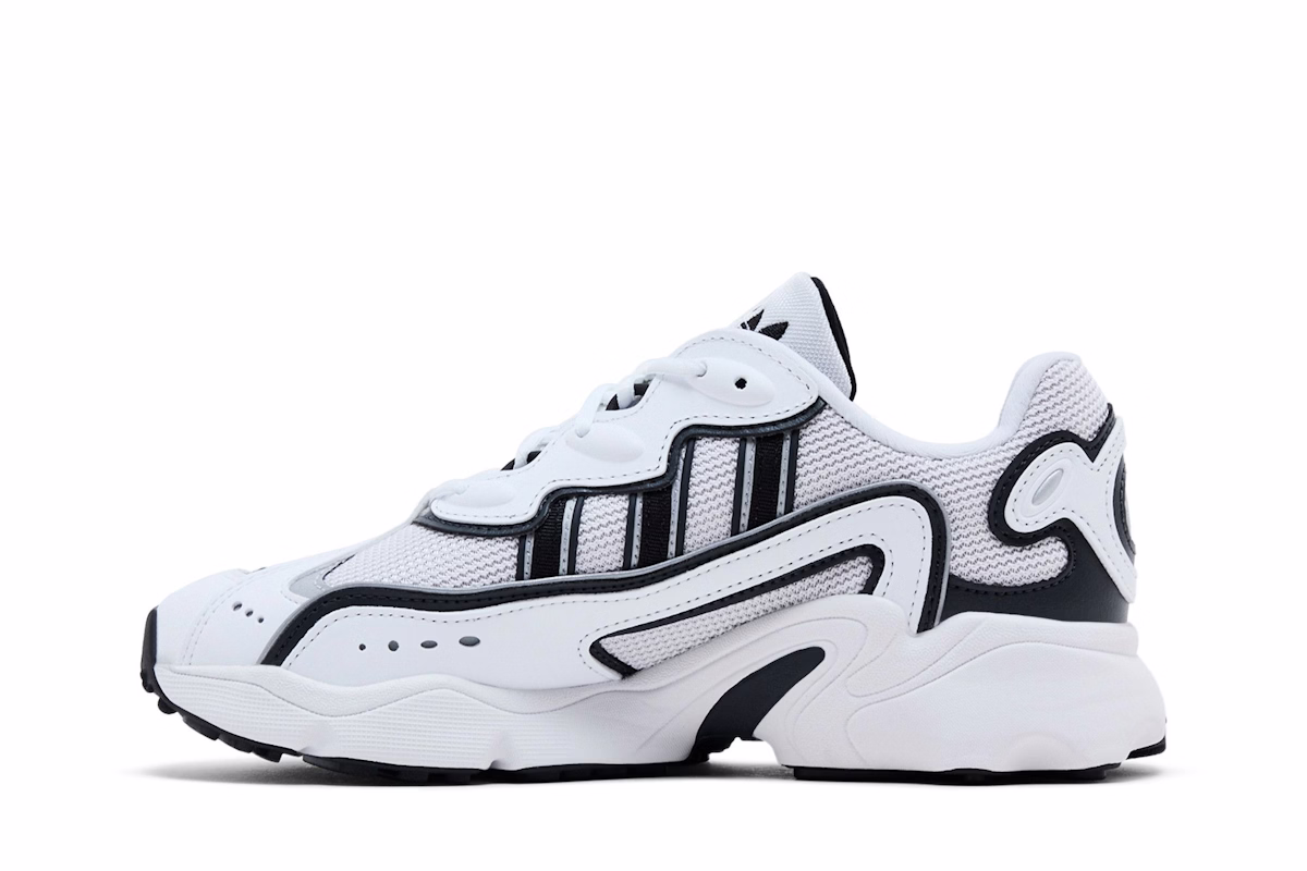Erlebe ultimativen Komfort und Style mit dem adidas Ozweego OG 'White Black' (IG6073) für Damen. Diese Sneaker im Retro-Stil bestechen durch ein elegantes weißes Mesh-Obermaterial mit markanten schwarzen Akzenten und dem ikonischen Drei-Streifen-Branding. Die Adiprene+ Zwischensohle sorgt für unvergleichliche Dämpfung, während die robuste Gummiaußensohle Strapazierfähigkeit und Traktion garantiert. Vervollständige deinen Streetwear-Look mit diesen trendigen Sneakern, die klassische Ästhetik mit moderner Funktionalität vereinen.