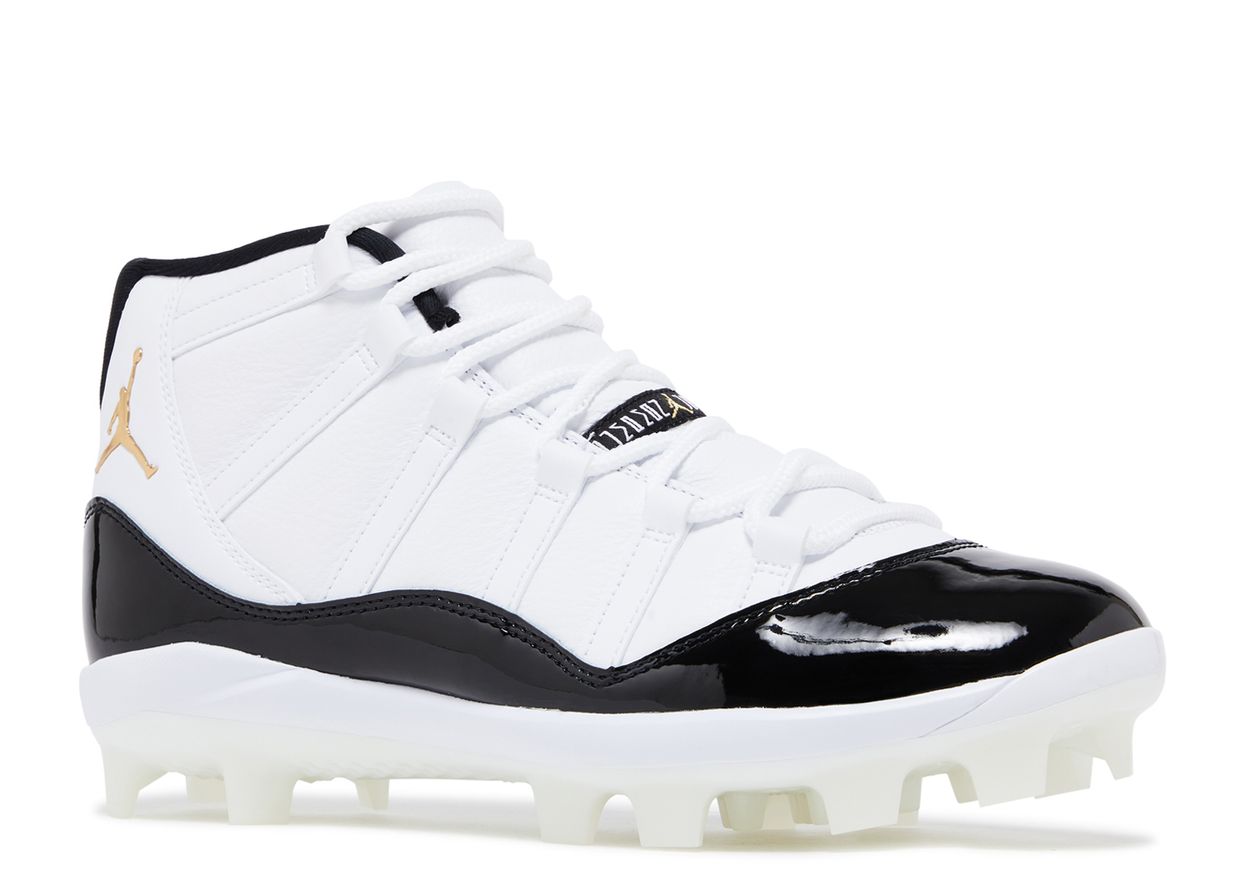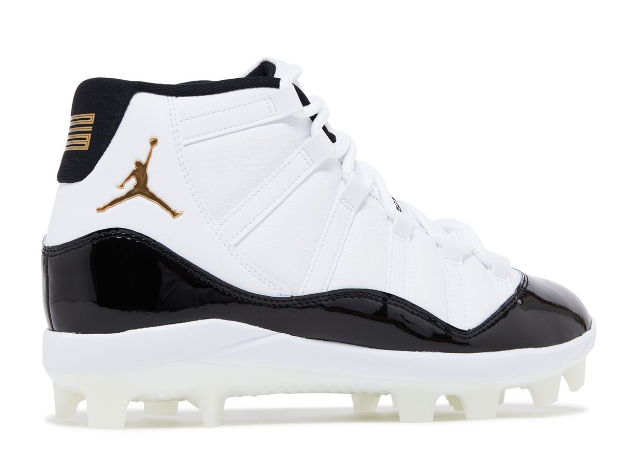 Inspirée de la silhouette emblématique du basketball, la Air Jordan 11 Retro MCS « Gratitude » apporte une touche iconique au terrain de football américain. Cette chaussure présente une empeigne en cuir blanc et un garde-boue en cuir verni noir brillant. Le logo Jumpman sur le côté du col et le chiffre « 23 » imprimé sur la languette arrière brillent en or métallisé pour un contraste saisissant. Une semelle intermédiaire en mousse sur toute la longueur assure une légèreté optimale à chaque pas, tandis que la semelle extérieure est dotée de crampons moulés pour une adhérence maximale sur le terrain de football.