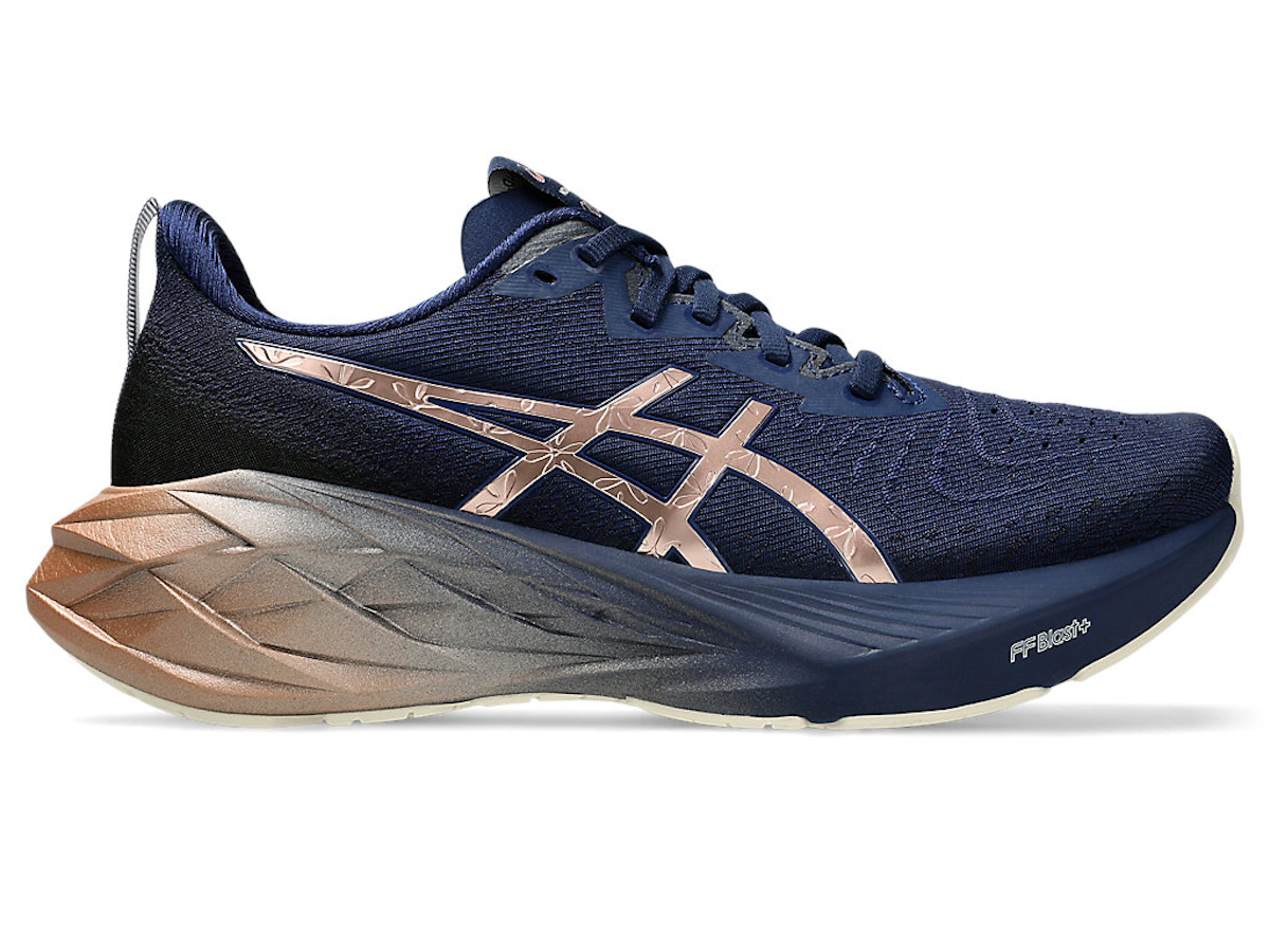 Découvrez une nouvelle sensation de course avec l'ASICS Novablast 4 Platinum « Blue Expanse Rose Gold », une chaussure de running haut de gamme alliant performance et style, conçue spécialement pour les femmes. Cette chaussure de running de pointe est dotée de l'amorti FF BLAST à retour d'énergie dans la semelle intermédiaire, offrant une foulée réactive et un confort exceptionnel, aussi bien sur les courtes que sur les longues distances. L'empeigne Blue Expanse, rehaussée d'élégants détails or rose, crée un look moderne et stylé, parfait pour l'entraînement et les loisirs. Le mesh respirant et fonctionnel assure maintien et fraîcheur même lors d'efforts intenses, tandis que la semelle extérieure en caoutchouc résistant garantit une excellente adhérence sur toutes les surfaces. Que vous repoussiez vos limites sur la piste ou que vous fassiez vos courses avec style, l'ASICS Novablast 4 Platinum combine technologie innovante et design sophistiqué pour vous accompagner dans tous vos mouvements. Couleur : Blue Expanse/Rose Gold. Numéro d'article : 1012B739-400. Empeigne : Tissé. Semelle intermédiaire : FlyteFoam Blast+. Couleur : Bleu marine.